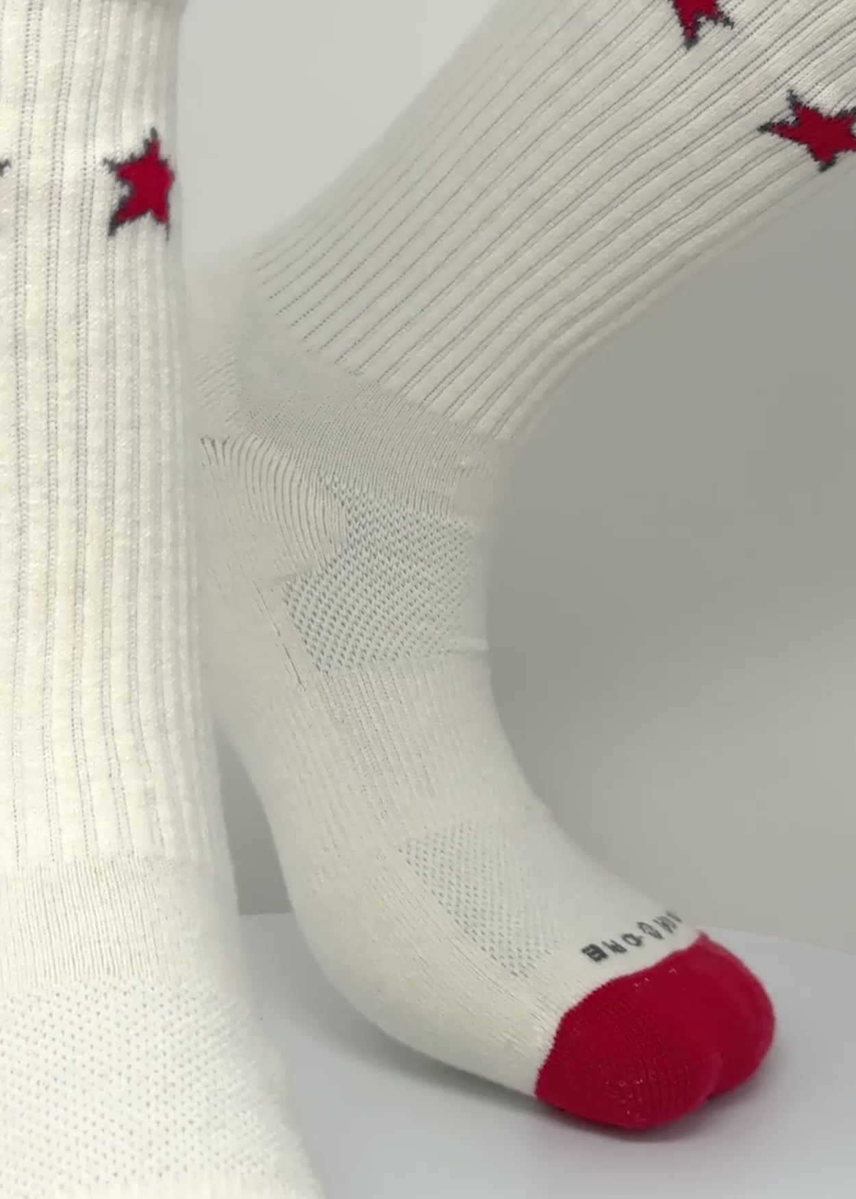 Turn it up. Rock Star takes inspiration from the forearm tattoo of my college rock band's frontman (true story, you know who you are), and delivers it in sock form for the rest of us. With a crisp white base and a bold wraparound line of red stars, this crew-length sock brings a high-impact stage presence without sacrificing comfort or performance. Made from breathable merino wool, it’s built to wick sweat, fight odor, and stay soft no matter how loud life gets. Whether you’re hitting the stage or just hitting the gym, this is one of the best socks for men who live loud and rock hard—I love you brother!